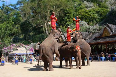 大象们表演跳舞〈摇头摆尾的太笑人了〉、踢足球、拔河〈十几个游客都拉不赢它〉、平衡木大转身等等。一个公象大转身成功后,一个母象给它献上一朵玫瑰花,它在表演场转了半圈,又转送给了一位漂亮女游客。把大家逗得哄堂大笑。大象也爱美女。