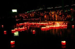 歌舞看完后,又在广场领取纸灯笼,每个游客一人一个河灯,在广场围成几圈,主持人不知说了些什么,没听懂,也许是什么仪式吧!总之是吉祥如意的意思。然后排着队,浩浩荡荡地向河边走去。这时天已黑尽,看到的全是头尾不见的闪着光亮的红灯,那场面真是壮观。
