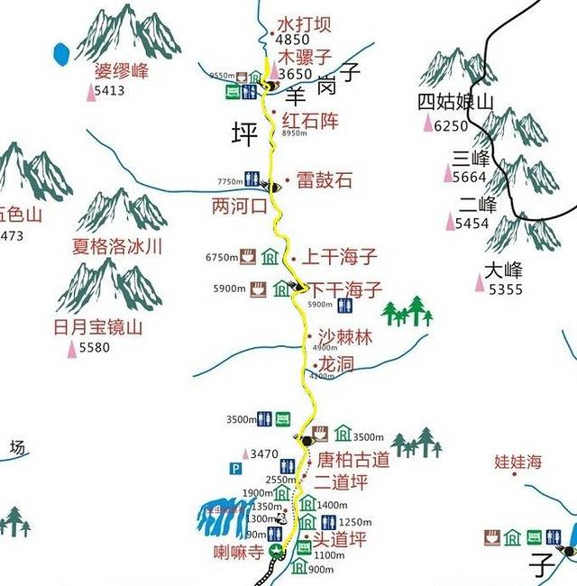 长坪沟:徒步或者骑马,前半部分有木栈道,可以看到四姑娘山,生态游,如不穿越,1天时间