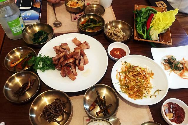 韩国人吃饭都是一口进去一半菜一半肉,营养比较均衡,像我这种不爱吃菜的,到了这也入乡随俗觉得还挺好吃的。