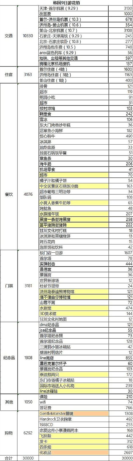 九天一共花了三万元,简单算到首尔的这五天基本上是16000元,平均一人八千(欲看详情,可点大图),大致如下: