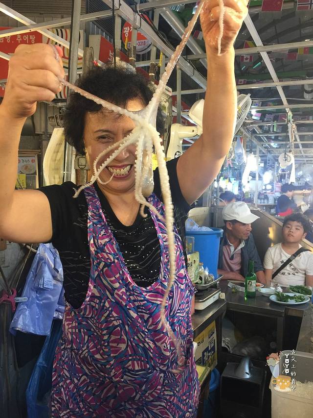 热情的大妈招呼我们吃活章鱼,盛情难却,大妈开心的样子和身后冷漠脸的小朋友对比鲜明。