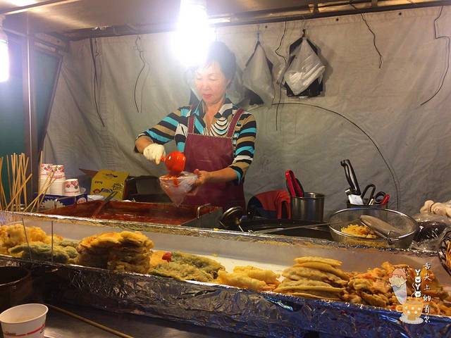 市场分为横竖四个区域,每个区域密密麻麻的小摊都卖同一种食品,一区卖煎饺,二区卖炸货、三区卖海鲜、四区卖水果。