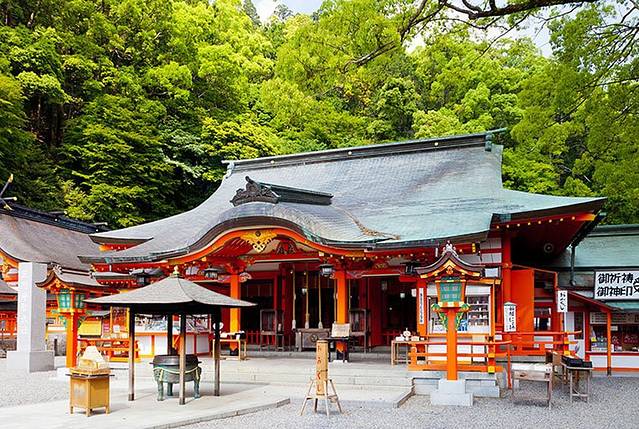 熊野本宫大社是日本全国三千多座熊野神社的总社,神社供奉的神据传说是中国天台山飞来,驱使八尺鸟(三只脚的乌鸦,相当于中国传说中的金乌)当作神使的太阳神。因此这座神社的处处可见三角的八尺鸟的形象,威风十足。本宫大社台阶下不远处是世界遗产熊野本宫馆和本宫的原地址所在地大斋原。
