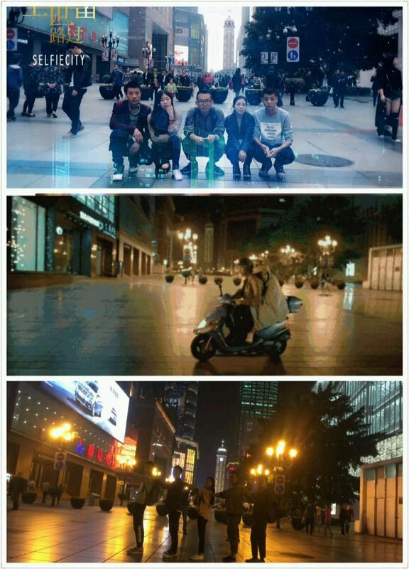 这个电影的镜头是晚上,但是我们白天拍还有晚上拍,就在解放碑旁边。