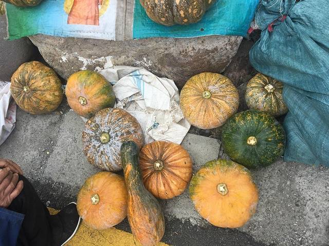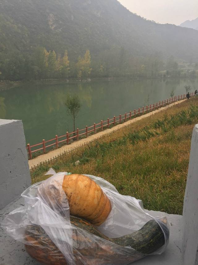 由于出门便不是大早,故而到达游客中心时,已到午膳时分。停好车,稍微遛遛,忽然毛毛雨了。老爸说上坡儿上看看,我在用嘴巴答应的同时,满心都在惦记对面儿路边儿老爷子卖的南瓜。拉着老爸赶快过去挑。3个南瓜,12块钱。其中2块钱是老爷子说再多给他2块钱,我们一想老爷子年岁大,怪不容易的,多2块就多2块吧。结果其中一个长南瓜有些绿,给家中坐镇的老妈电话,被告知绿的不甜。额~~~~~临走时过去跟老爷子商量能不能给换个旁边黄点儿的,老爷子换了一张铁青脸,一句“那些不是我的。”就给我们打发回来了。跟先前买的时候,态度迥然不同哇~~唉~回家煮的时候,多放点儿糖吧。