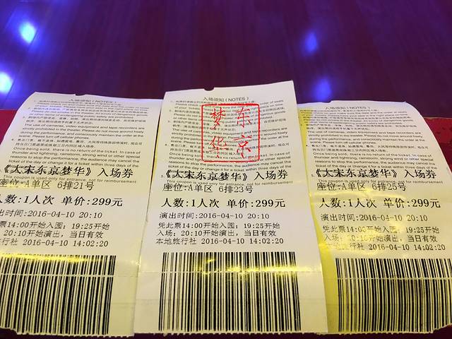 【门票】清明上河园100,东京梦华实景演出299元(此为A区演出门票,下午两点可凭借演出票免费入清明上河园,在淘宝上买的250,如果现场买的话需要299)