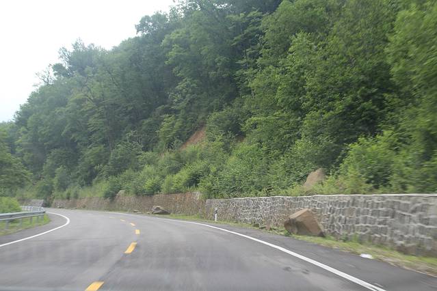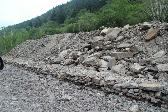 落石路段 ,路况 开始 险峻 ,坡陡 弯急 ,出现 U形弯 。