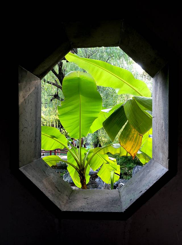 看这里建个画框,里面就是一幅画了,古人的设计多么巧妙,园林里许多的窗户正是这样设计的借景。