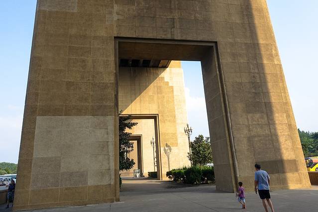 南京长江大桥在市区的西北边,说起来是有点远了坐车坐了大半个小时才到,在桥头底下的大桥公园进入。这座1968年竣工的大桥真的完美的体现了那个年代的钢铁风格,这种大气而又厚重的感觉现在的建筑再也找不到了。从底下坐电梯上桥头需要15块的电梯费,虽然是坐地起价不过还是强烈推荐上去看看,所谓站的高看得远,在桥头堡上可以俯瞰整个长江大桥,看长江上的渡轮和大桥上的汽车和火车川流不息几十年如一的繁忙。