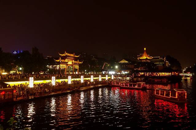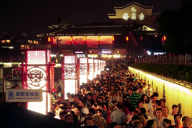 这是对于现在秦淮河畔最好的一句注解,这里早已没有什么王谢之类的贵族,也不像其他城市的老街专做游客的生意,这是一条繁华的不像话的商业步行街。想去体验一下夜游秦淮的游船可是这排队的人群竟然看不到尽头,夫子庙前秦淮河畔几无落脚之地,八月的南京还真是热闹呢。