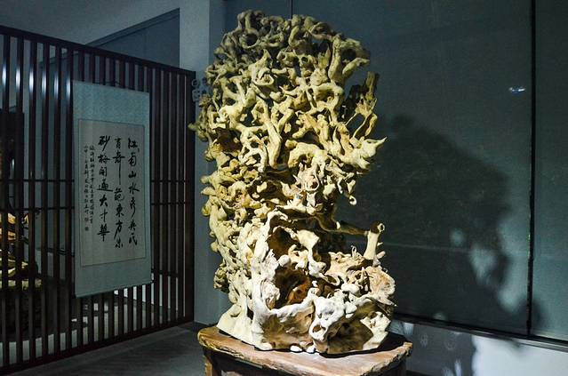 博物园第一件展品《东方梅艳》,是来自吉林的500多年前的水曲柳树根,根系交织盘错,如同开出朵朵梅花,与园外梅林之景甚是相配。