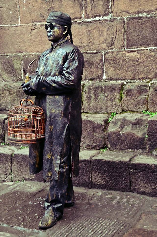 跟着导游走小路,中途还路过了当地的一个小学,这里真是五脏俱全。穿过昨晚来过的古城墙大门,我们看到一个惊喜,有人在行为艺术,好像他一直都在这里站着,竟然还有游客以为他是真的铜像!