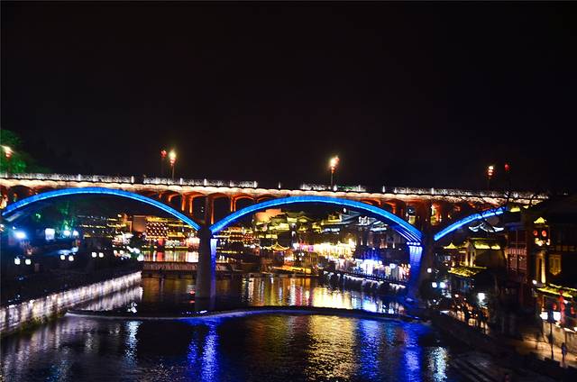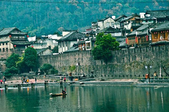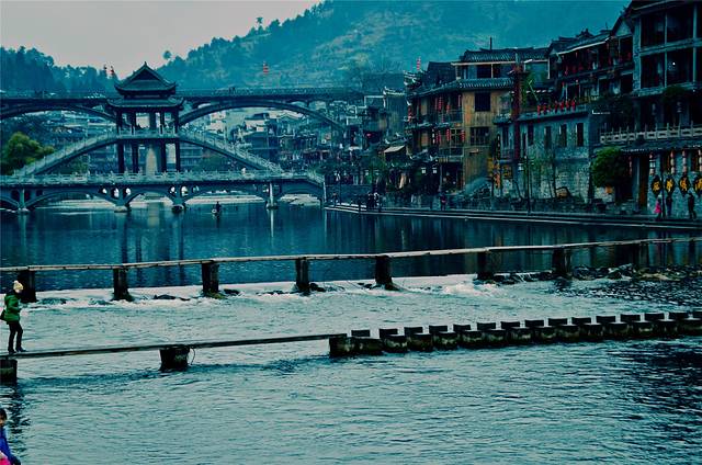 泛舟的船都停靠在沱江上游,“跳岩”的旁边。前一天晚上由于天黑路滑没敢尝试,再一次来到跳岩,等船期间大家都试着踏一踏这石墩。跳岩是一座古道桥梁,最早建于唐代,是乾州进入当时的五寨司城唯一的必经之路。现在看到的是清康熙43年重修的,仍是凤凰至乾城的古道。跳岩全长100米,是湘西特有的交通方式,也曾是进入凤凰古城的主要通道之一。历史上乾嘉苗民起义,辛亥革命,凤凰光复起义,解放战争,这里都是进攻凤凰古城的主要通道。当地人走在上面如履平地,看似简单,但真正尝试才发现没有那么简单,脚下就是涛涛的江水,每一个石墩的面积也只够盛下一只脚。