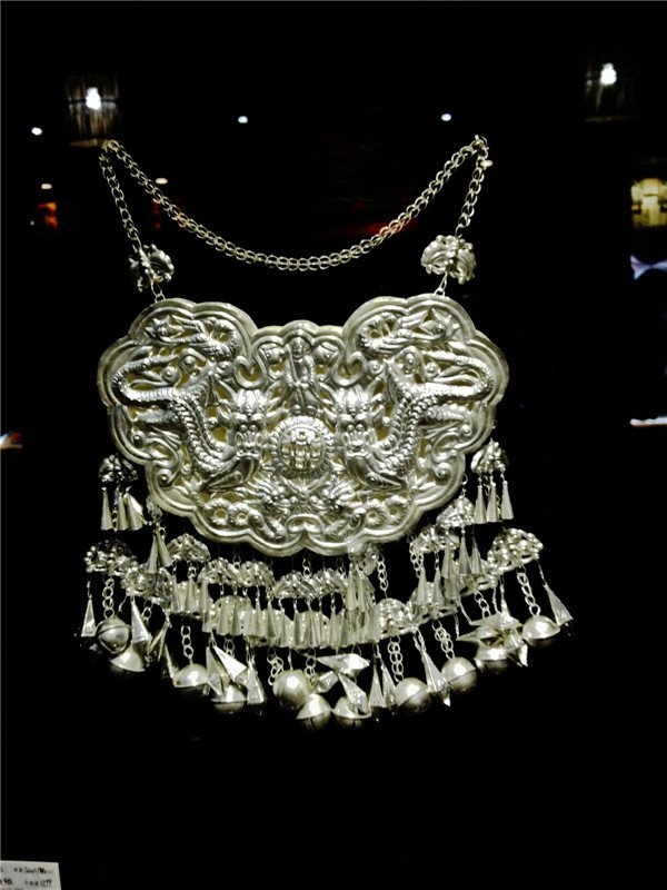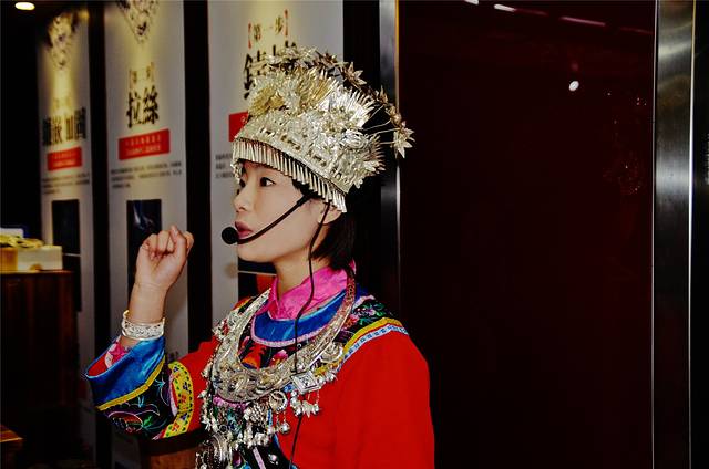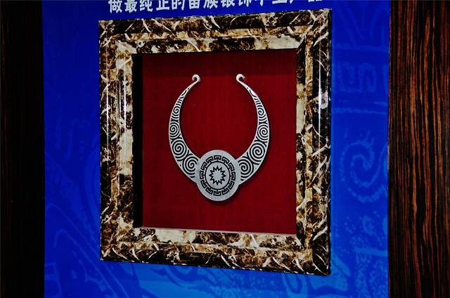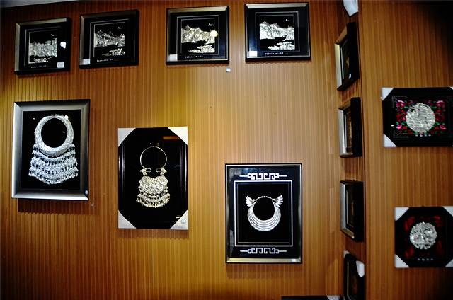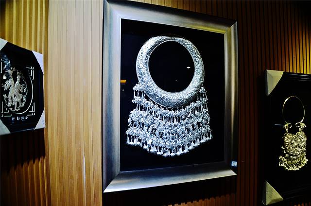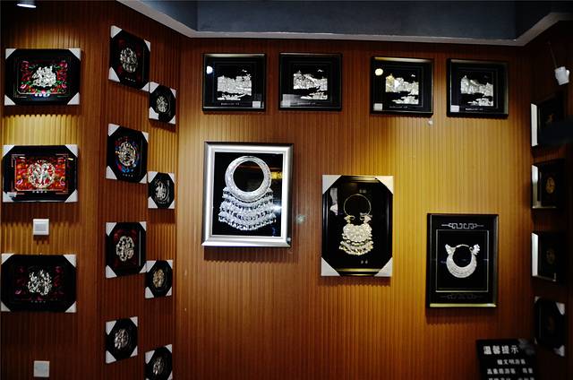 进门就看到苗族银饰工艺的传承人在制作银饰,导游小姐身穿漂亮的苗族服饰在细心的为大家讲解,介绍拉银丝的工具。进去里边的大厅就可以看到各种银质饰品了,最吸引我的是临近出口的那个巨大的苗族银锁项链,有一面墙那么大,用精美来形容它恐怕都不够了。
