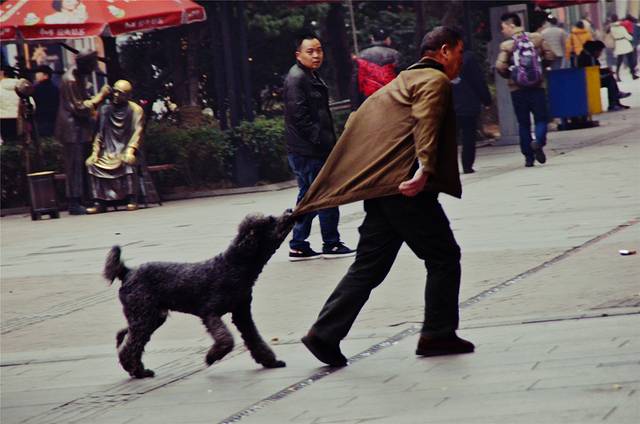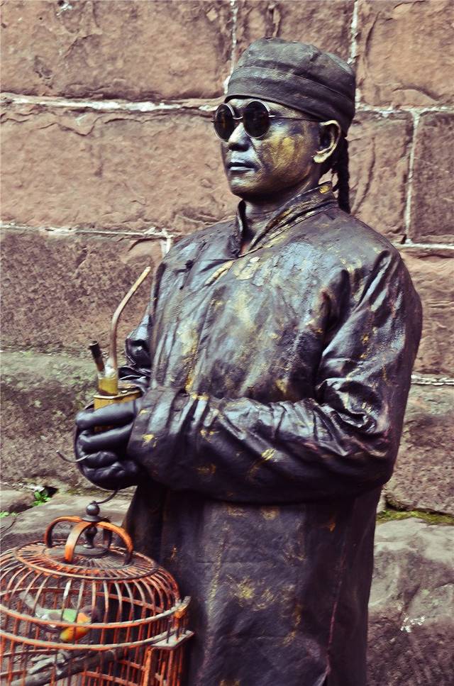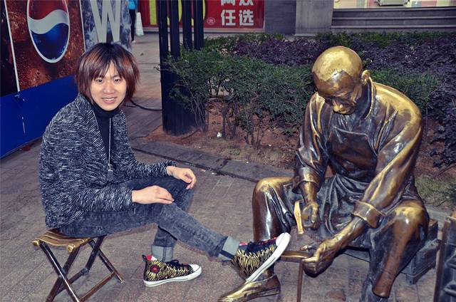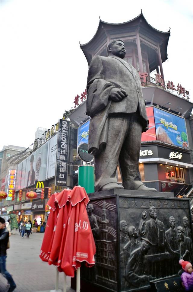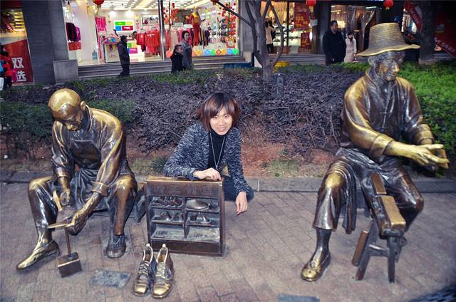 是步行街就自然会有一些铜像,像是约定俗成了。遇到第一个铜像之前,有一只大狗在我们周围跑来跑去。当我坐在这个铜像作势要拍照的时候,一个中年男人走过来告诉我要怎么摆姿势,一只手握这个,一只手握那个的。。。我当时就感觉长沙人好热情,倒是我的同伴“2姐”使眼色让我不要随便和陌生人说话。拍好了,站起身刚向前走两步,就看到那个男人和大狗同时出现在我们的视野中,我第一感觉他是狗的主人,看到下面的一幕,我开始怀疑自己的判断,狗咬着这男人的衣服不放,一路追一路咬,看不懂,真是怪狗加怪人。到此,黄兴街就走的差不多了,决定打道回府。