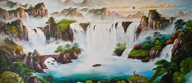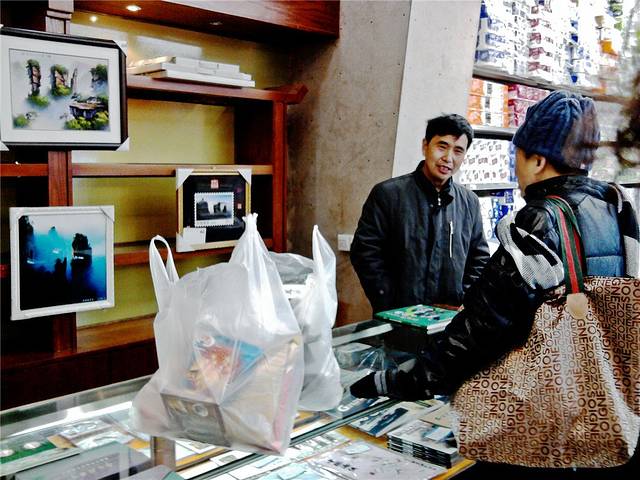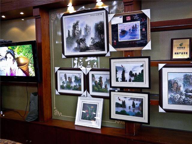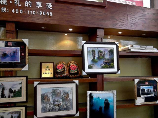 小雨滴不时飘落,天气愈发寒冷。时间虽早,但已有不少旅行团赶在我们前边。跟随我们的大队伍浩浩荡荡进到门楼里,导游去售票窗口买票,招呼所有队友原地等待。闲暇时间有机会将四处浏览一番,门楼大厅里边装潢的很气派,又不失当地特色。一抬头我便发现了在张家界所独有的“沙画”艺术。它是用属于张家界山上的石块和石块研磨成的沙子为“颜料”作画而成的,画的主题永远是张家界的美景。这是我出发前不久的时候从CCTV4《远方的家》节目中了解到的。