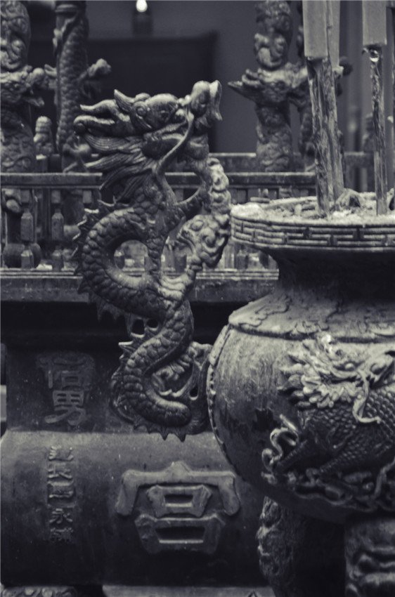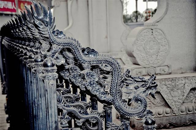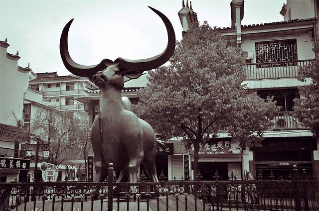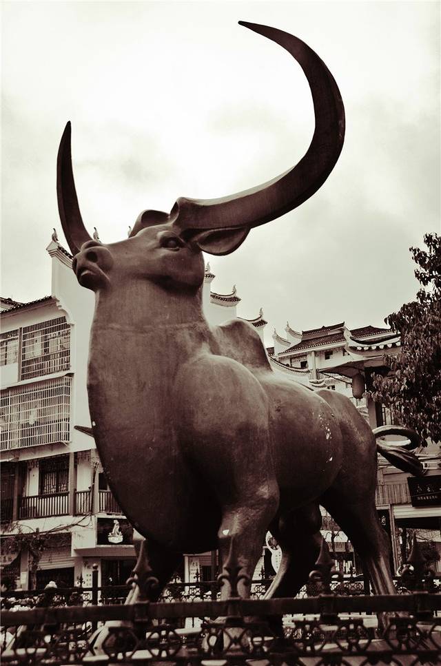 还记得刚刚提到的“太极”吗?凤凰的“阳极点”便是这三座石牌坊所在的区域,惊奇的发现它们就在昨天我们住的旅馆旁边。导游说其中两个写有汉字的牌坊不是苗族的,苗族是没有文字的还记得吗?牌坊后边不远的广场上有一个铜牛,铜牛所在的位置就是最精准的“阳极点”。其实最早铜牛并不在那里,而是在牌坊前的一个大理石高台上,现在还可以看到石台上痕迹,之所以被移到后边去,也是讲求了风水之说。牛铜像的造型也很特别,身形前边像鹿,后边像马。