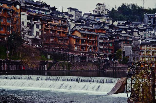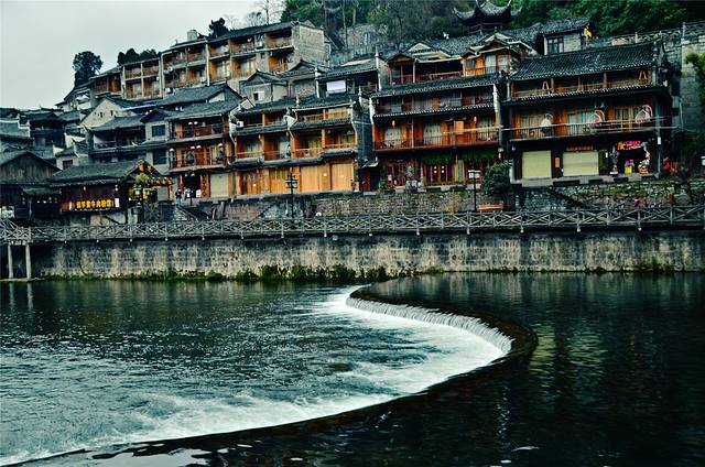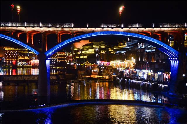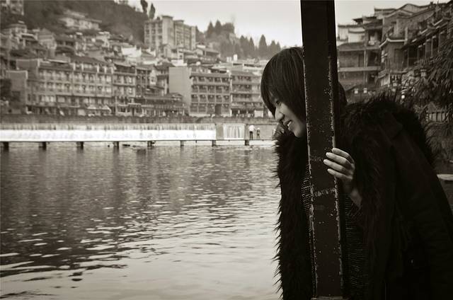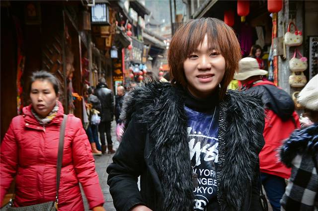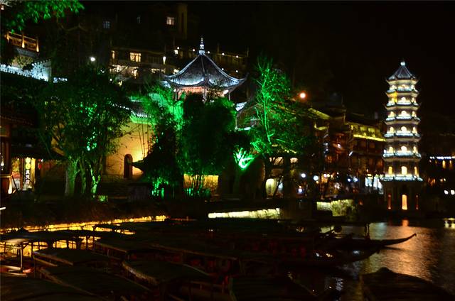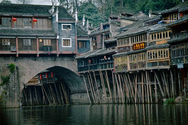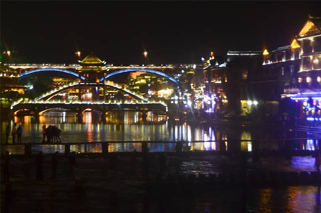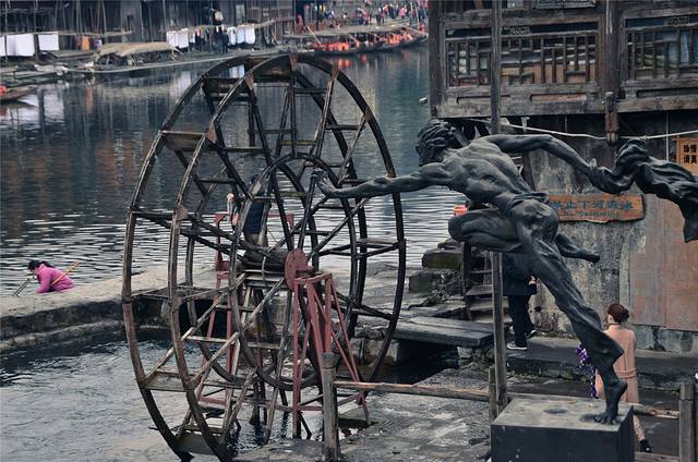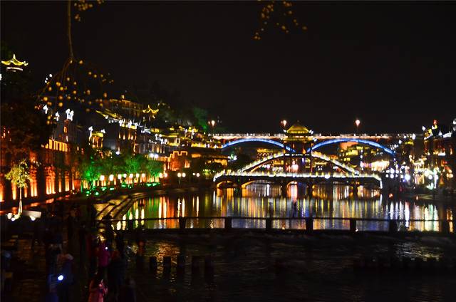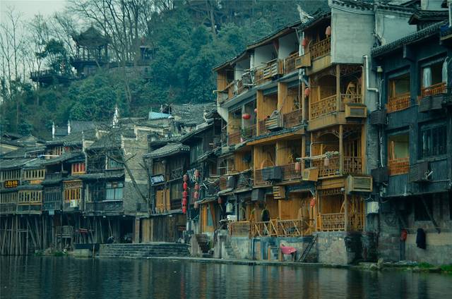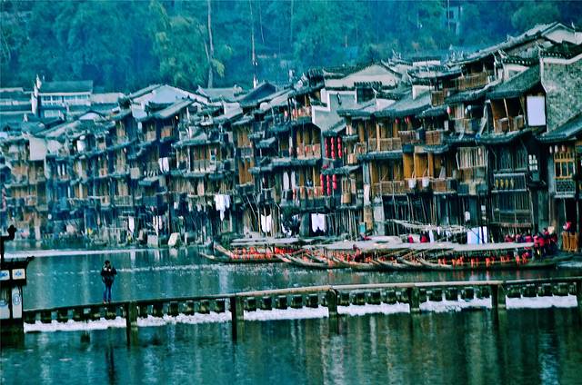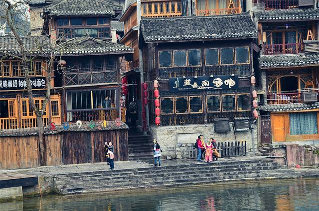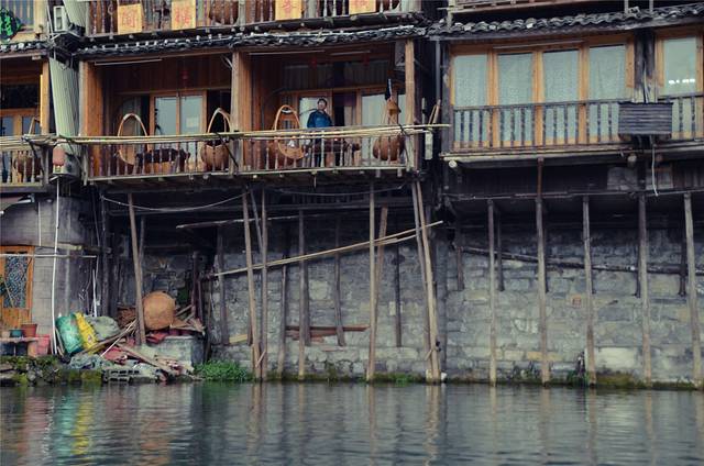 时间再拉回来,离开“银饰博物馆”,我们有四十分钟的自由活动时间,于是马不停蹄的围着沱江猛拍。此时两岸的游人多了几成,当地的妇女也开始陆续拿着衣服到江边浣洗,好惬意的生活画面。沿着江边漫步,不时会有小贩向游人推销“河灯”,河灯虽然美,尤其在夜晚江上浮起点点星火,但是每天都往江中放河灯,很难避免对江水造成污染,为了当地人赖以生存的环境,以及对我们美丽凤凰的保护,不会让它很快的消失,我建议最好还是固定节庆时间再放吧。