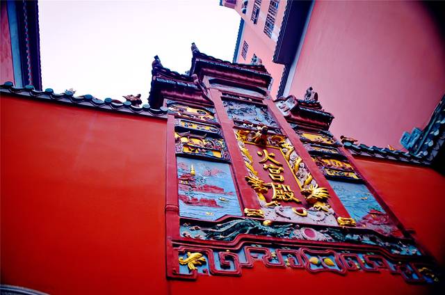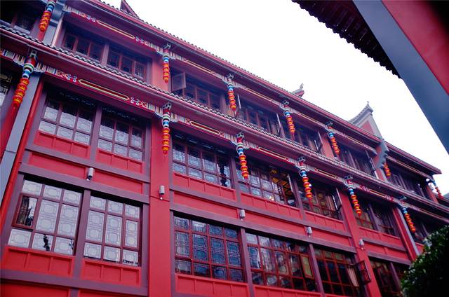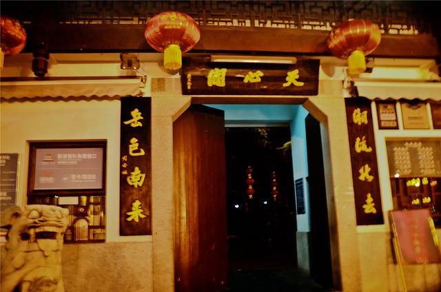 走过熟悉的红色门墙,空间甚为宽敞,像是个大型庙会,好不热闹。宫殿中建有两座庙——火神庙,财神庙;还有二阁——普慈阁、弥陀阁,我只看到了供奉观音菩萨的普慈阁,弥陀阁没有看到。殿后的高楼就是饭店了。之后在长沙其他地方,我还看到了几个分店:东塘分店、五一分店。
