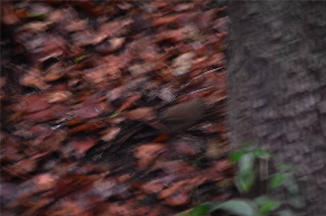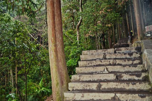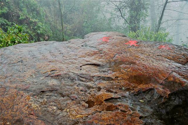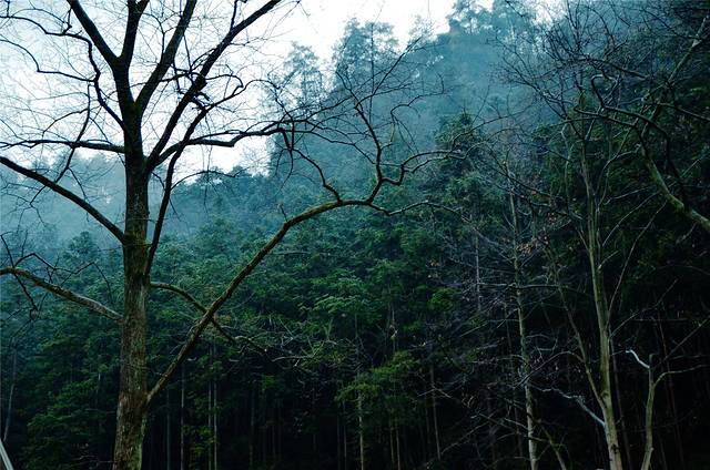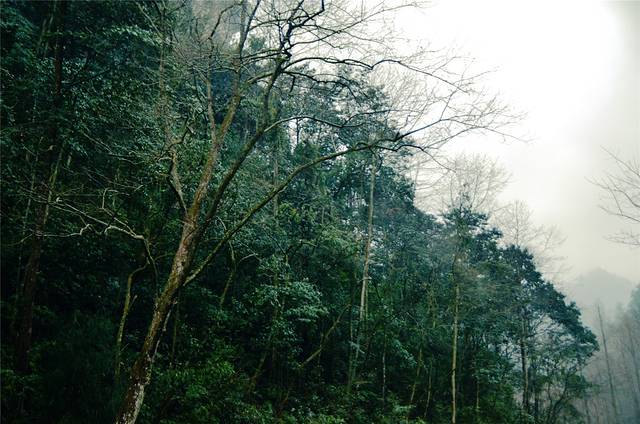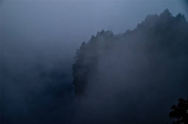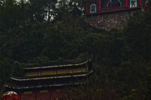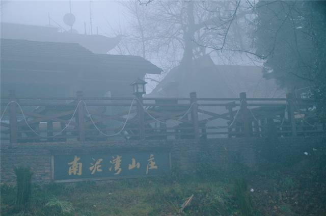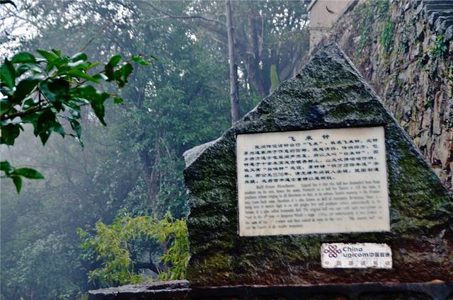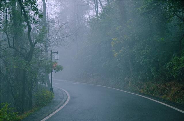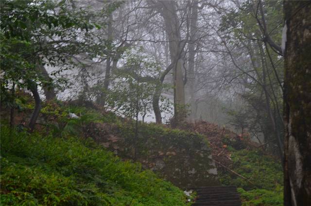 走出【观音阁】天又开始下起小雨了,刚刚褪掉的雨衣又穿了回来,因为雨水的原因,雾气慢慢也大了起来,山下的一切渐渐看不清了。继续回到柏油大道上,看路牌下一站【云麓宫】。路上几乎看不到任何生物,能见度也非常小,如果说这个时候我没有任何一丝畏惧自然是骗人的。 忽然听到旁边树林里刷刷作响,走近一看原来是一只叫不上名字的小鸟,非常活泼,根本不肯定下来让我拍一张,我也没有更多精力调试相机帮它好好拍张美照,随便按下几次快门,尽快上路了。
