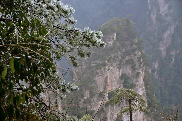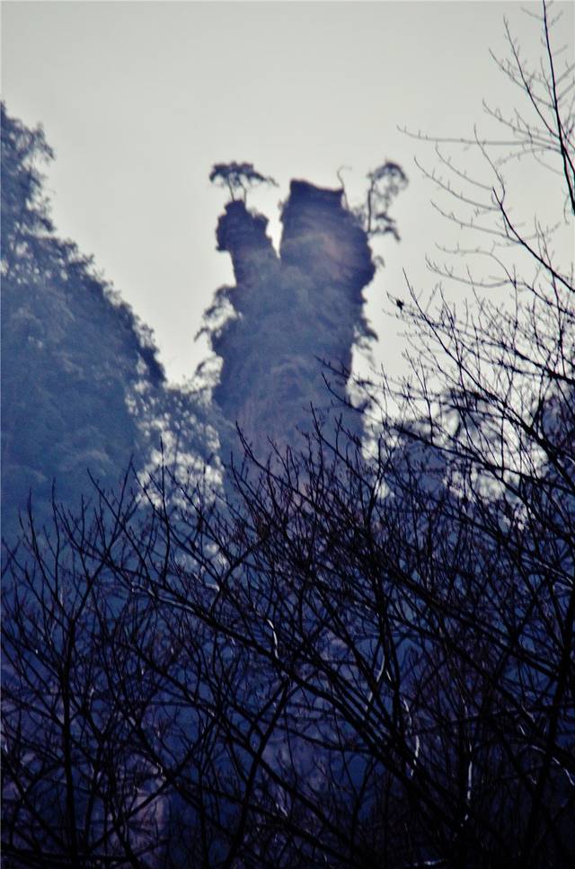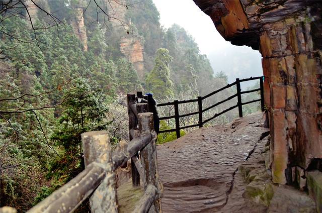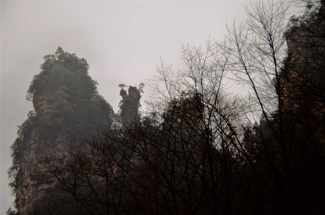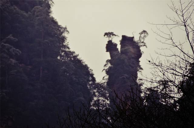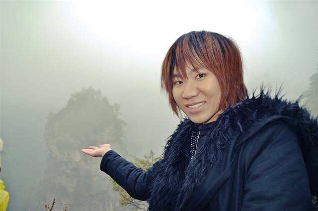 山间雾气越来越大,此时的山路上已经结了薄薄的一层冰,这两天我穿的鞋子不防滑,大大小小的跤摔了有三四次。山路不是很宽,再有很多人堵在路上拍照,前行都很困难。本来已经走过一段路了,“2姐”眼睛很尖,看到远方的岔路上有一个“阿凡达”!我二话不说决定反回去。这个“阿凡达”是当地放在这里给游人拍照的,自然是收费的,还拦了起来。我觉得既然张家界是因为《阿凡达》才有了新的生命力,景区应该做一些特别的设施,比方说“阿凡达的主题游”,做个好一点的模型嘛,不要像这种做的那么粗糙。