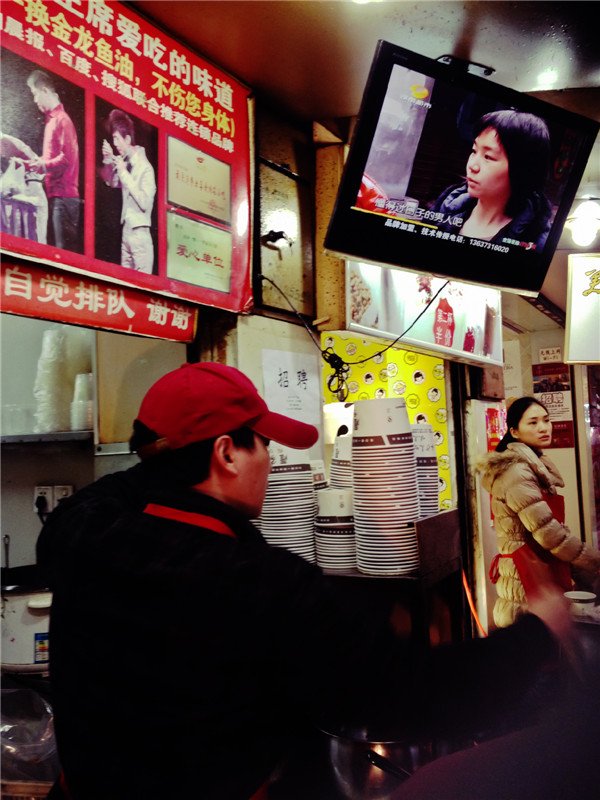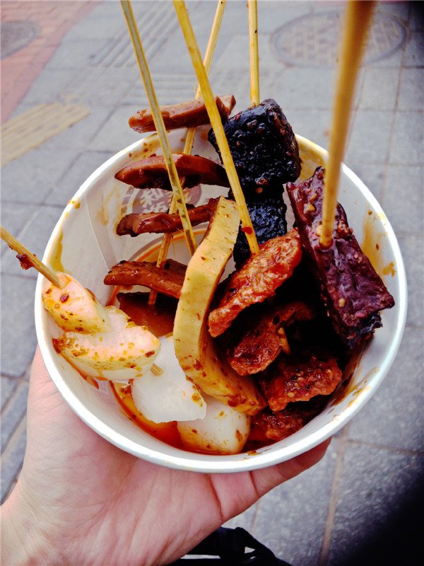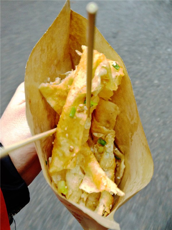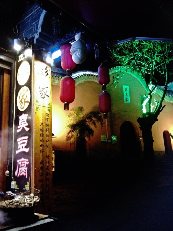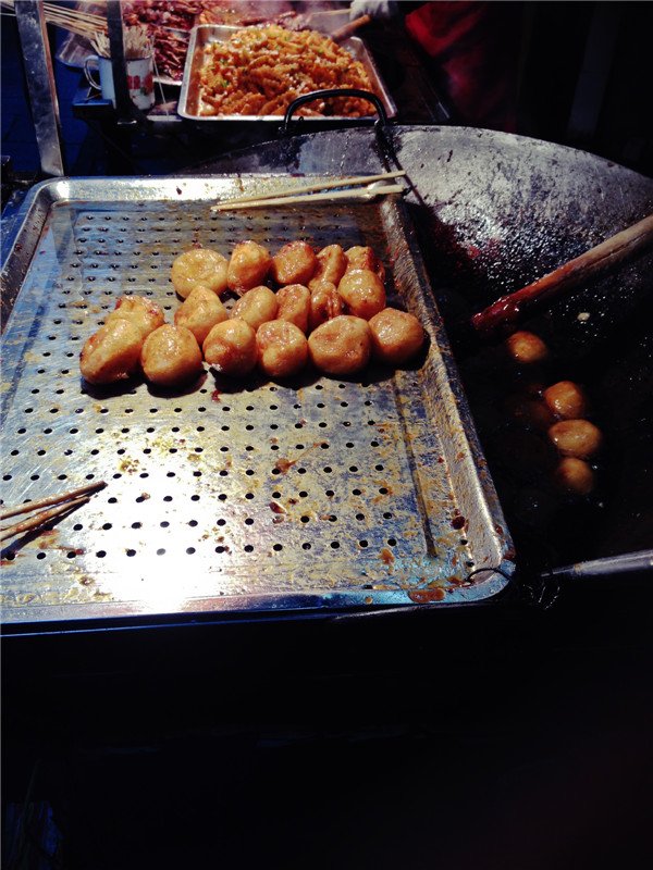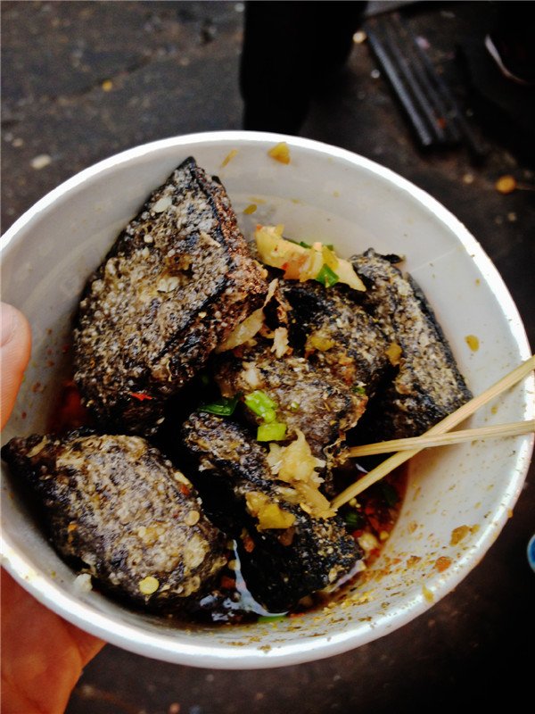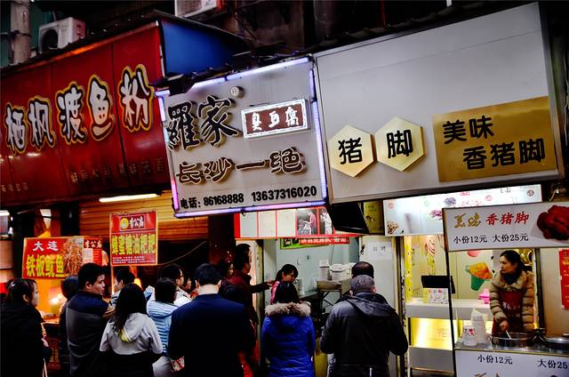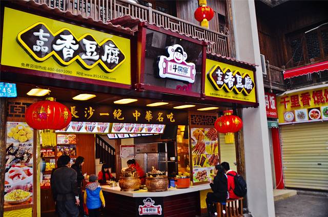 在一个岔口看到很多人在排队,原来都是在等长沙最有名的“臭豆腐”。“2姐”这个吃货自然不会放过。排了足有半个小时的队,终于如愿以偿。臭豆腐从外观上看真的是不太好看,黑黑的。闻起来、吃起来其实也没感觉有臭味,就是炸得焦焦的,大把的辣椒撒在上面,非常辣!再一次感叹这里是中国的娱乐之都,不少店家都会将明星来此品尝的照片作为招牌,升级一些的就有电视播放自己的美食出现在芒果台的画面。