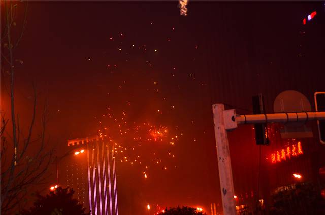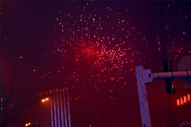 沿着【五一大道】走回酒店,路上经过“新世界百货”,在“屈臣氏”买了洗发水。出来的时候发现对面的大楼前(大成国际大酒店)在放礼花,这个春节始终感受不到一丝过年的气息,倒是这个时候突然给了我感觉。在门前看了好久的礼花,没有结束的趋势,便从看礼花变成等礼花。至少有十多分钟,还是没有结束,每一束烟火安静的冲上上空,响亮的爆开。。。一个接一个的放,不想再等下去了,于是我们一面看着路,一面望着天,跑着躲着。上空没有大厦屋檐的遮挡,看着那爆开的烟花,每一次落下的火花就似是朝你的脸飞过来。