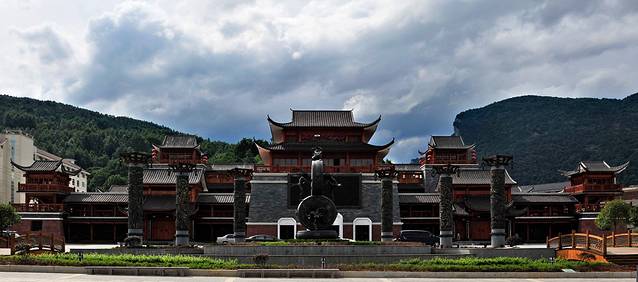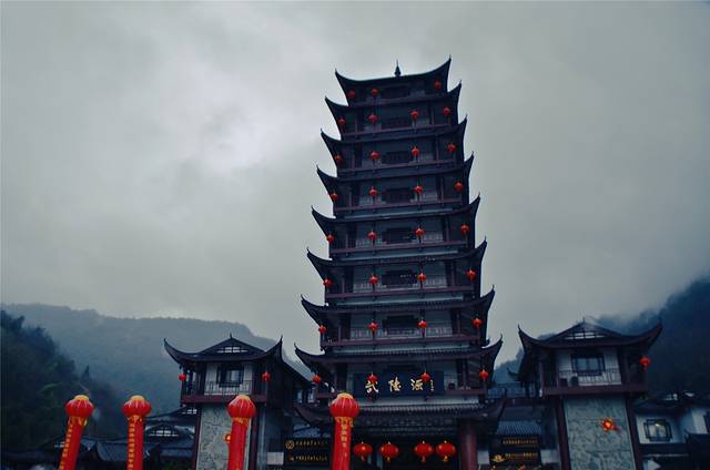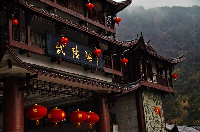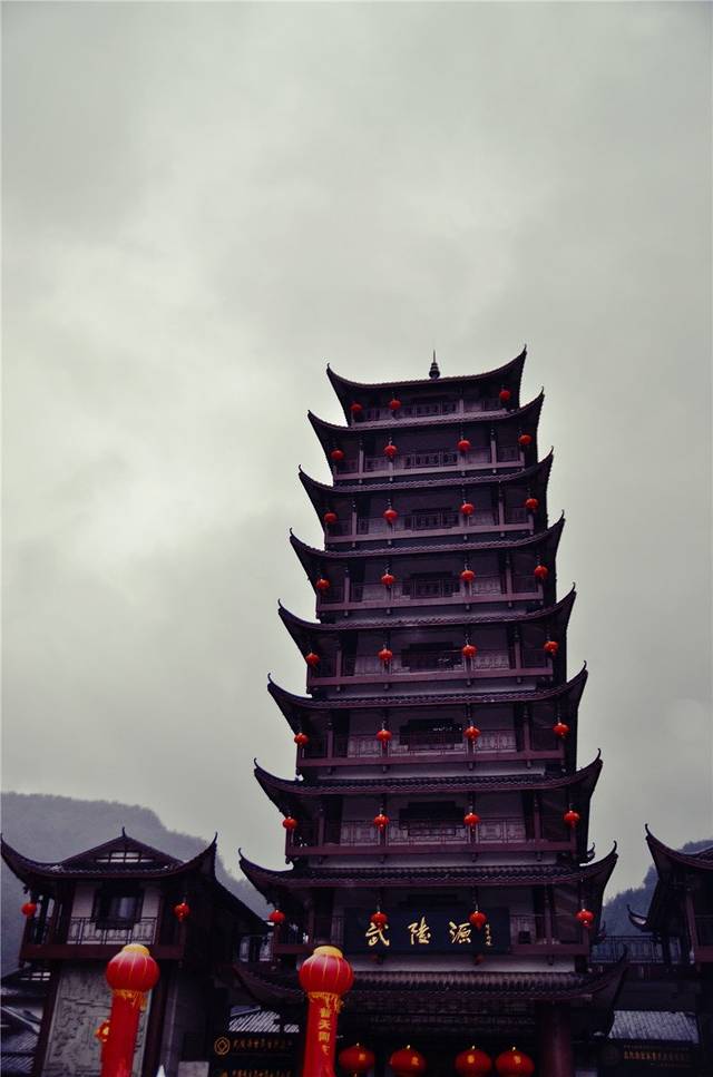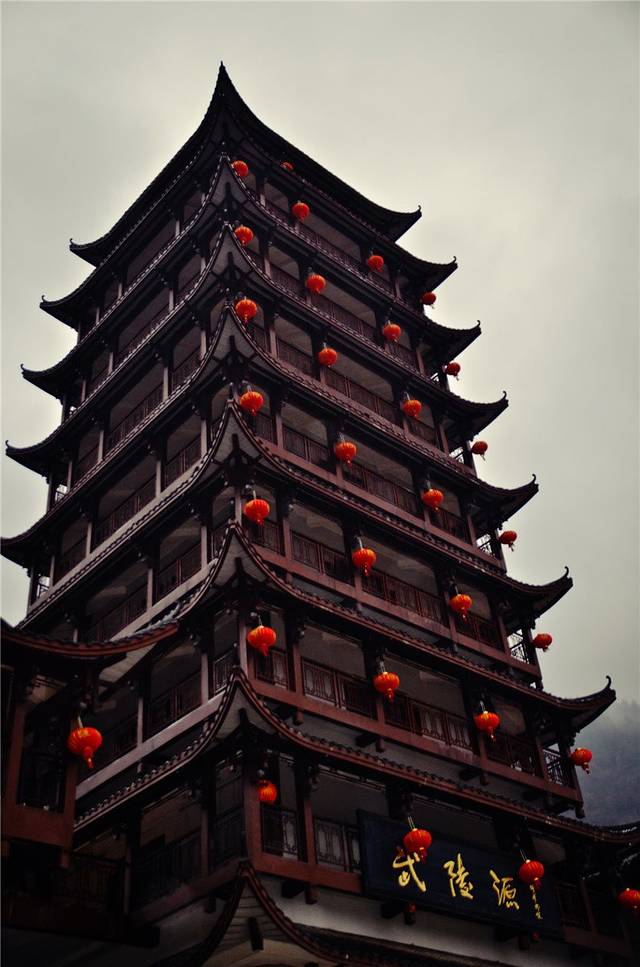 【武陵源】是张家界的重要部分,也是张家界美景的最集中部分。(由张家界市的张家界森林公园、慈利县的索溪峪自然保护区和桑植县的天子山自然保护区组合而成,总面积约500平方公里。)最先看到的就是这一座很高的门楼。据说是以“庭院深深深几许,转角飞檐檐九重”为创意,集世界自然遗产和土家建筑文化(小青瓦、坡屋面、外挑檐、转角楼、浅灰墙)于一体,是在2005年重建的。耗资2500万元,建筑面积5045平方米,其中主体建筑物共9层,高39.9米。