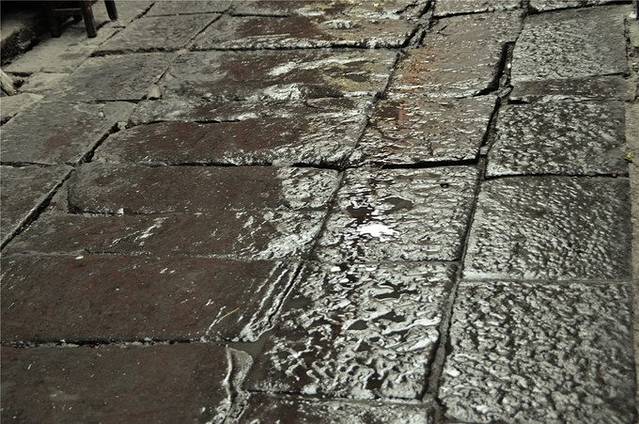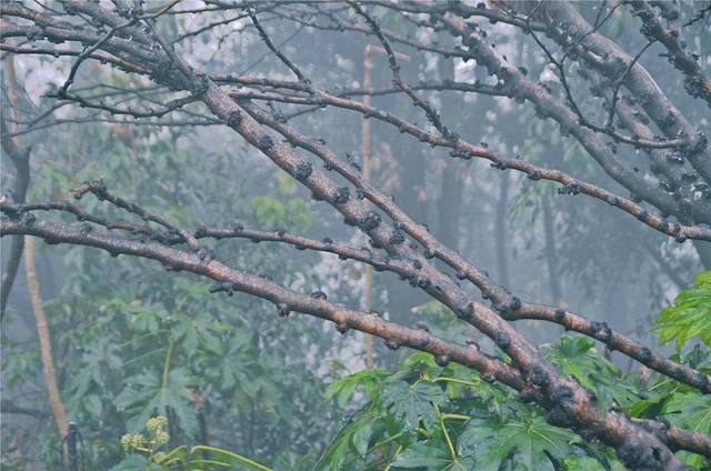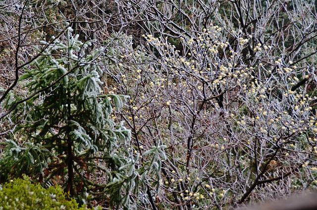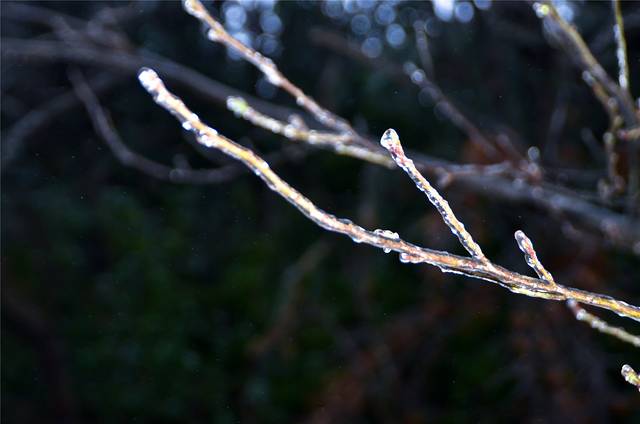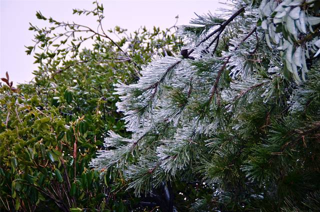路上突然听到有什么东西从树上掉下来,“哗啦”的一声,很多碎冰砸在地上,之后又看到好几次,原来树上结的冰太重了,自己就会摔下来。