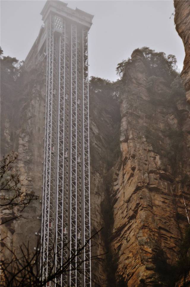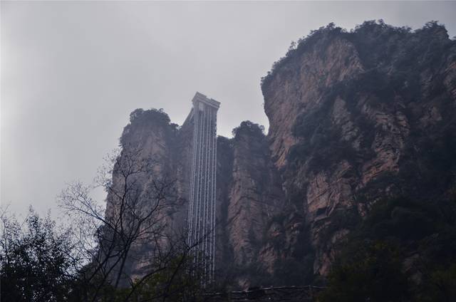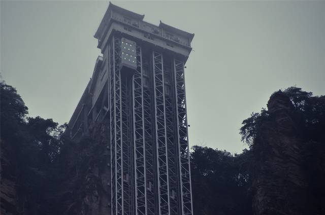 张家界的门票非常特别,是一张特制的磁卡片,会纪录下你的指纹,三天内可以凭卡随时进出景区大门。和我们一起排队的有多个团队,为了抢占先机,一进入景区,导游就带领大家一路跑到景区环保车的车站,去往第一站“百龙天梯”。它号称“世界上最高、运行速度最快、载重量最大的电梯”,也因此被载入吉尼斯世界纪录。当时我的脑子里有一个疑问,世界上最快、最高的电梯不是台北101吗?之后我还特意查阅资料,也没有一个真的结果,它说是就是吧。