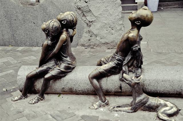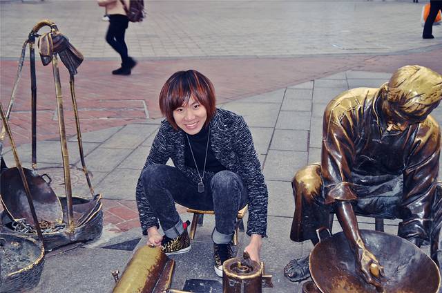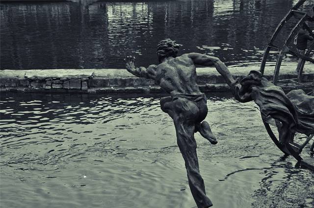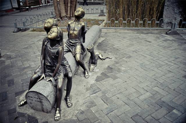 又来到这个雕塑了,单独拍了这个小男孩,因为淋雨的表情很到位啊。