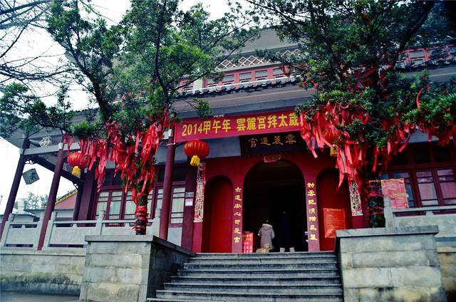 沿着小路上山,一开始只看到一个观景的亭子,还有一些练太极拳的海报。让我以为这个“宫”也许就是一个弘扬太极拳的场所,“文化宫”之类的。刚准备离开,绕过观景长廊,见到宫殿的正门,原来是一座道观。这里是收门票的,5元钱,守在门口的工作人员让我跪拜供奉在门口的神像,他在一旁敲謦,之后说了一些祝福的话。