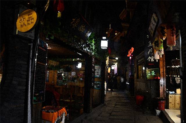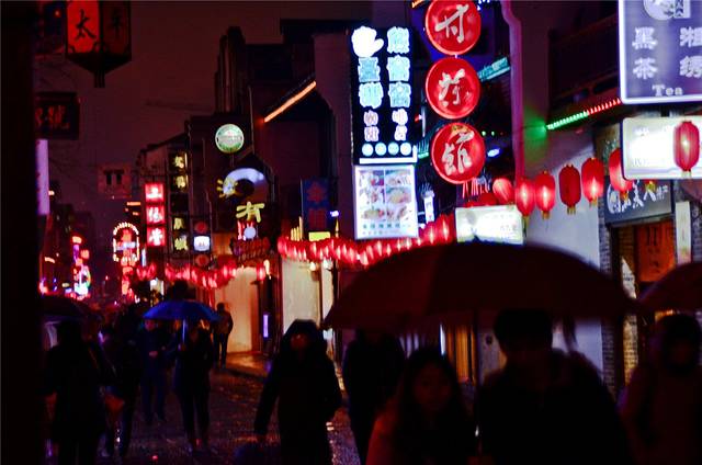 夜晚的“太平街”又不一样了,所有灯都打开。大衣里揣着相机,不时的拿出来按动一次快门,这一路的雨天,我的相机也真是遭罪啊,所以也顾不上调试了,从怀里露出来几秒赶紧收起来,更顾不上每张是否都拍的那么完美了。