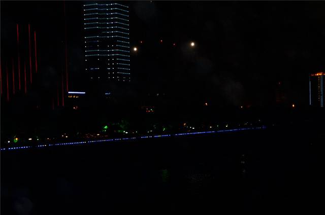 走过大桥,回望小岛,已经在一片黑暗中了,只有岸边的一排红灯。
