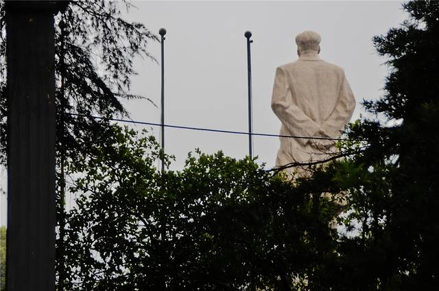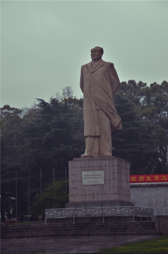 再次回到刚刚下车见到的毛主席像下,雕像身后是一条人字形的上山岔路,面对其右侧小路通往【岳麓书院】,左侧小路是去往【岳麓山】。