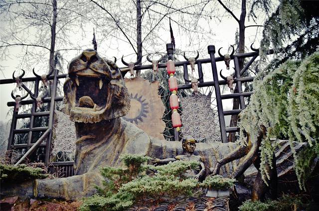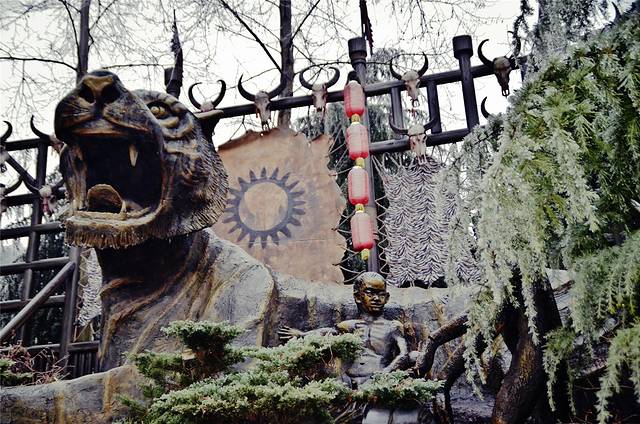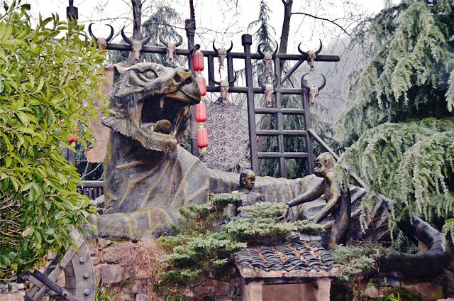 正对大门有一只巨大的铜老虎窝在你面前,还有一个孩子和一只巨猿坐在旁边,听当地人说这是土家族的图腾,他们自古流传信奉“ 以虎为父,以猿为母”。寨子里的导游阿妹,分不清楚究竟是苗家还是土家了。