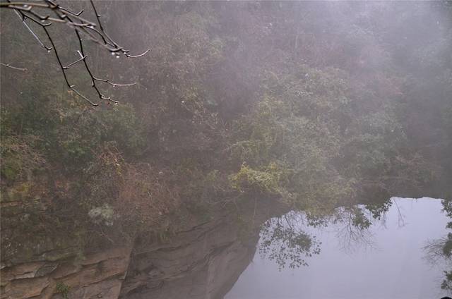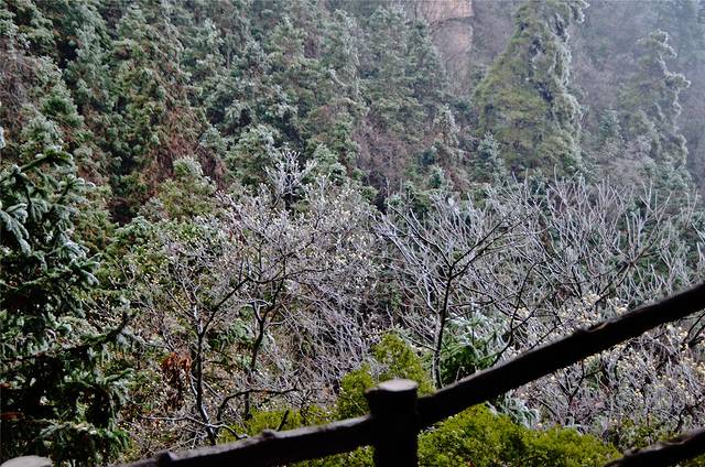 在这里看“悬浮山”非常模糊,眼前有很多树枝、植物遮挡,我心里很不甘心,难道就只能这样看它一眼吗?抱着遗憾的心继续前行,前边是一架铁桥连接对面的山。走上桥才发现,在桥上看“悬浮山”的视野是最好的。不过当天桥上人很多,而且桥面结冰了,非常滑。工作人员都在喊“桥上不要停留!”不过我还是拍下了这几张难得的照片。