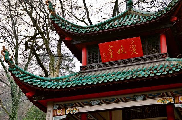 书院后门正对着的就是【爱晚亭】了。起初我奇怪为什么这个亭子会如此有名,号称中国四大名亭之一。原来这座亭子始建于清代乾隆年间,原来叫“红叶”或“爱枫”。之后由毕沅改名“爱晚”,取自杜牧诗句“停车坐爱枫林晚,霜叶红于二月花”之意命名。亭子古朴典雅,亭形为重檐八柱,琉璃碧瓦,亭角飞翘,自远处观之似凌空欲飞状。内为丹漆园柱,外檐四石柱为花岗岩,亭中彩绘藻井。“爱晚亭”在我国亭台建筑中影响甚大,堪称亭台之中的经典建筑。还有一点不能不提便是其横匾“爱晚亭”三个字是毛主席亲笔所提。