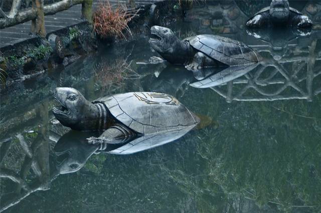 路过一个小集市,贩卖各种小玩意和当地小吃,给我印象最深的一家摊位就是卖非洲鼓的。(其实现在很多景区都能看到)再走过一条跨河石桥,来到了一片仿若梦幻田园的地方,到处可见绿植,还有各种动物的石雕。