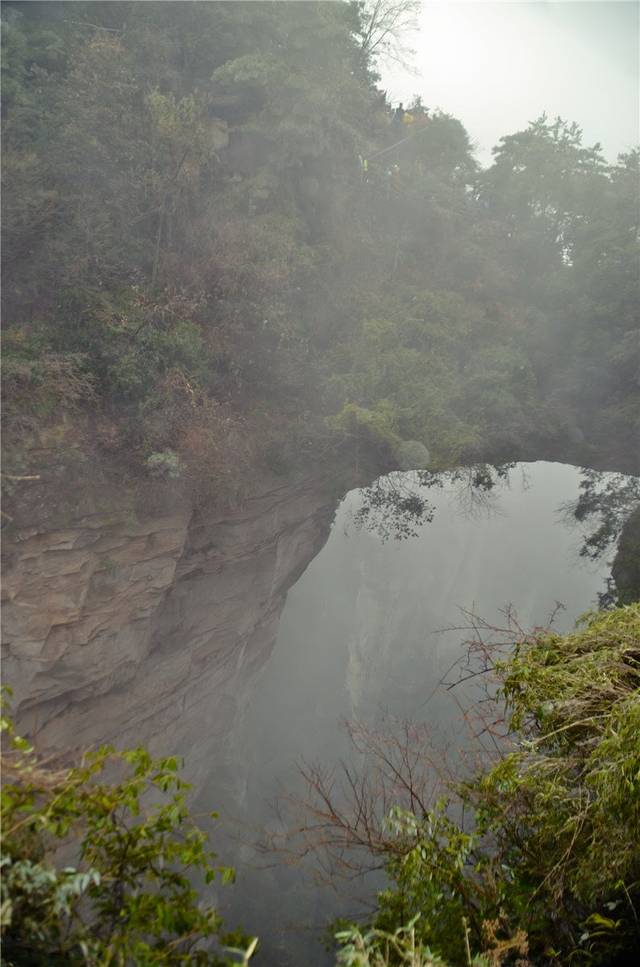 走过一连串白雾,到达【天下第一桥】,虽然隔着大雾,不过还是觉得很神奇,真的是天然一块大石头夹在两山中间,而且我们要走过去!!这是天然形成的一座桥,虽然后期加了护栏,不过随着时间推移,不知道这座桥会不会松动?