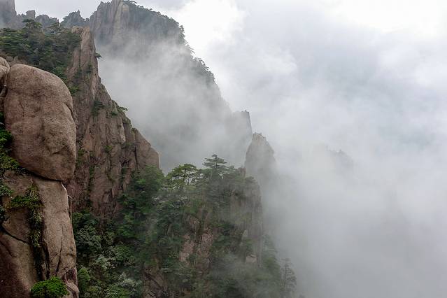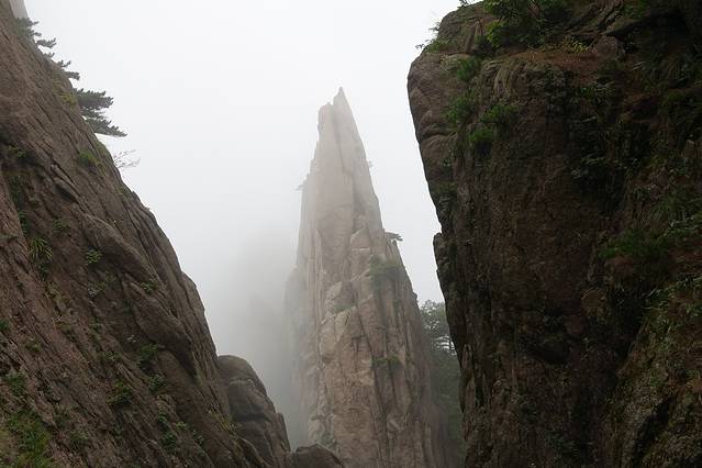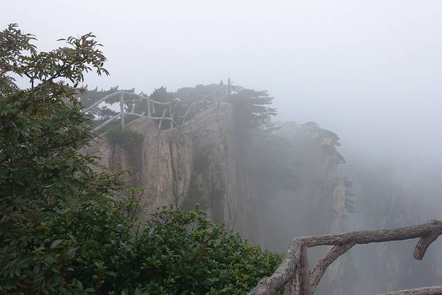 上山先去石笋矼,可是石笋矼到底在哪里呢,一路走栈道右手都是大雾,大雾会一阵一阵的被风吹散,远处的山峰时隐时现,结果知道我走到了始信峰也是没有望见石笋矼的踪影,全被大雾给埋了。