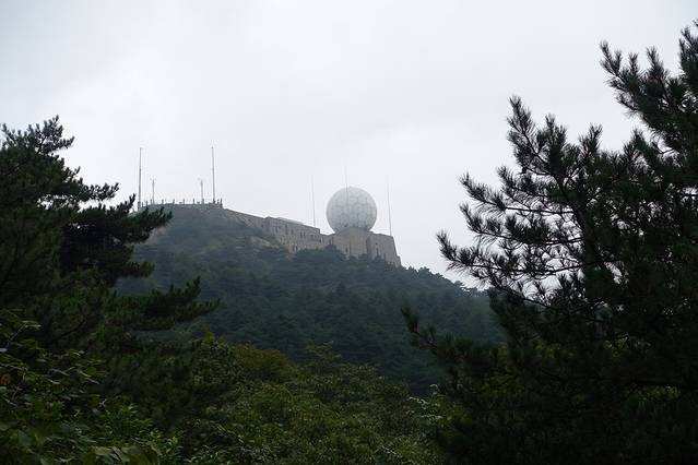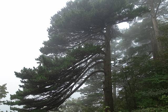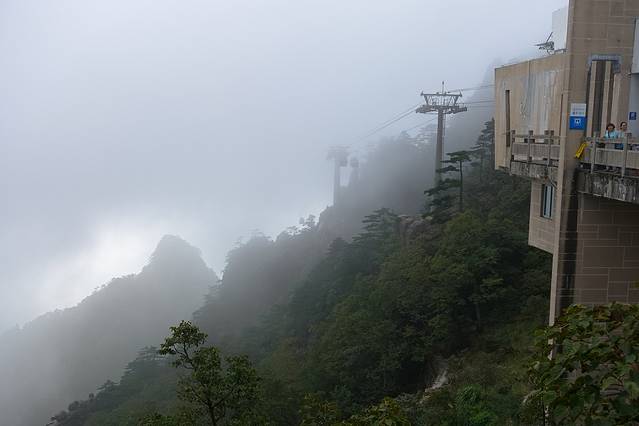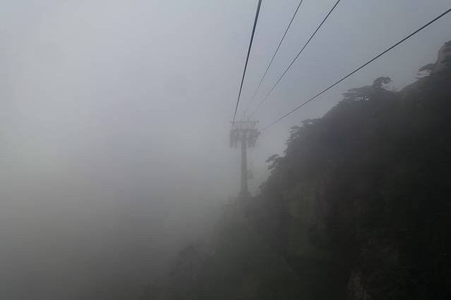 上山的路如峨嵋一般九曲十八弯甚至更陡,一开始周围全是各色松树,然后人群一声惊呼车子穿进了雾海,边上也没有松树了而且悬崖峭壁,心一下就悬起来了,而师傅艺高人胆大也丝毫没有减速的意思,转眼就开到了索道站。