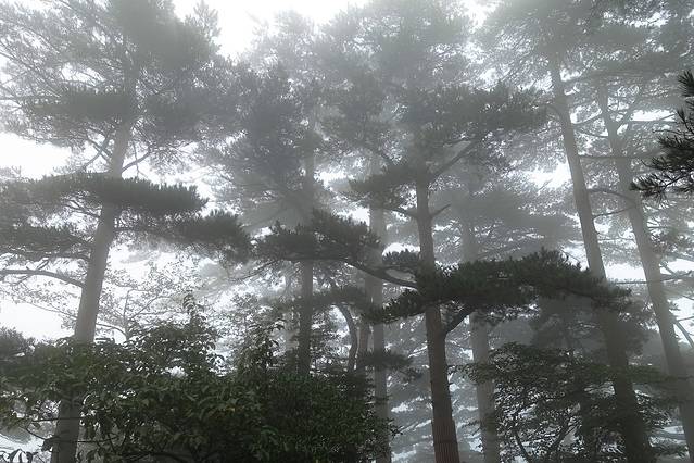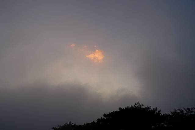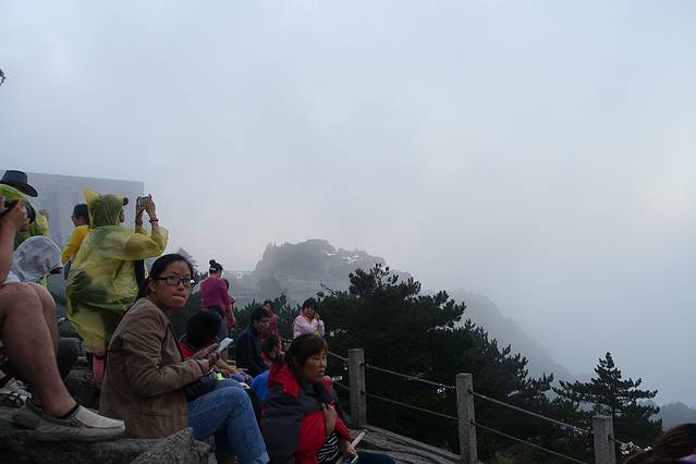 早上大雾弥漫,晚上也没有散尽,甚至还开始有点稀稀拉拉的雨点。光明顶上早已聚集了不少不甘心的人在这等日落,可是天公不作美至始至终太阳也不曾漏出一丝脸庞。不过听鳌鱼峰上归来的人说虽然时间短他们还是看见日落了,真是“一山有四季”,看不看得见都是人品使然,不可强求啊。