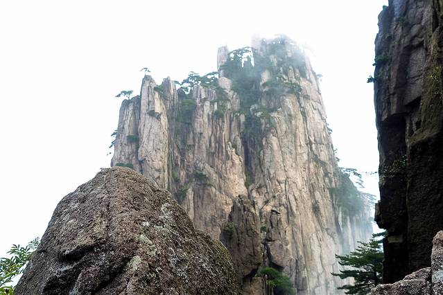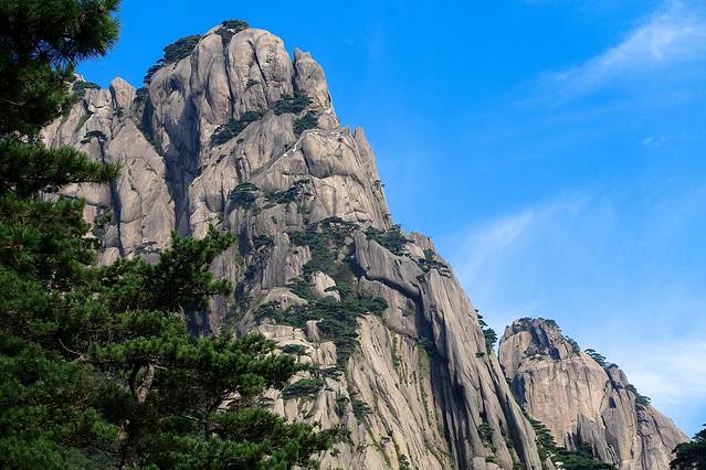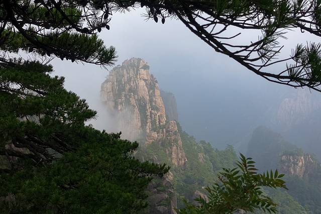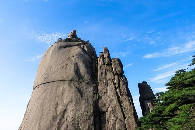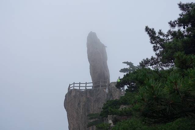 天都峰海拔1810米,虽然是黄山三大峰里最矮的,不过因为天都峰周围没有其他山峰阻挡,一柱擎天,最为雄伟壮观,初一看都会以为他是黄山顶峰。