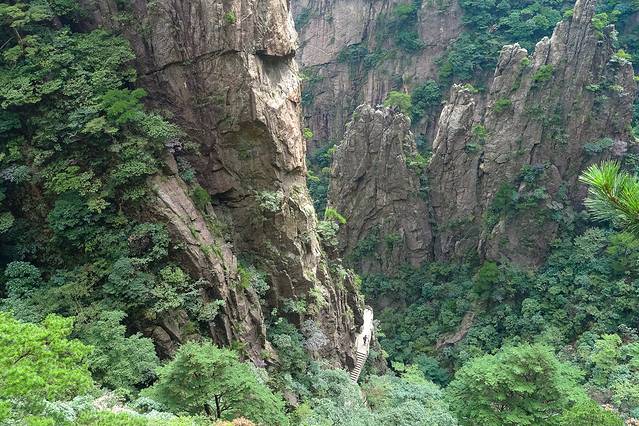 天都峰爬上大半之后回望来时的路,一条步道于巨石之中穿行,下山的时候没觉得陡峭,这么一看才觉得落差极大。