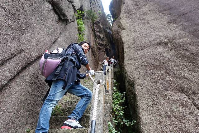 上天都峰的山路,两人宽 只有一边有简单的缆绳,一路上山可不能回头,一回头就是近乎垂直的山道。