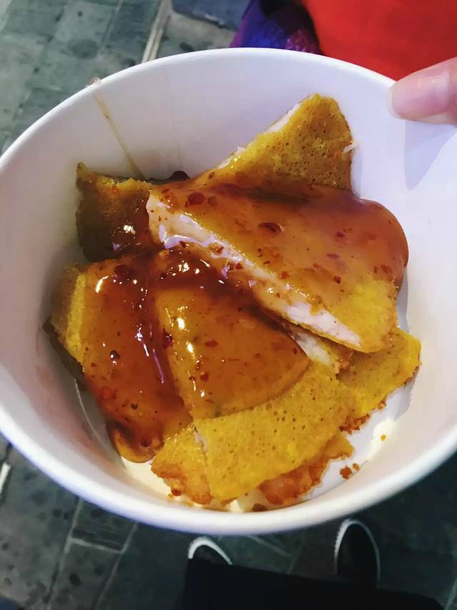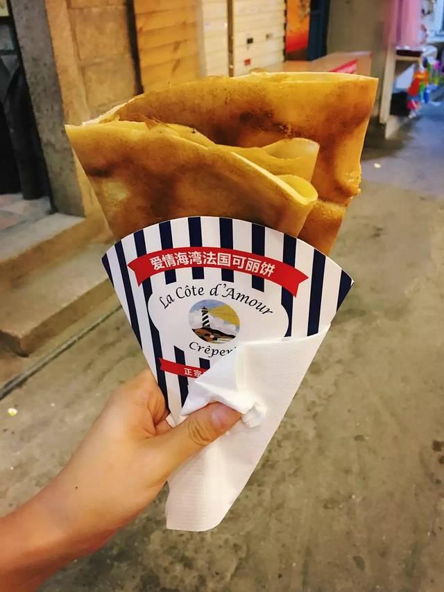 楼下的一个法国仁卖的,法国可丽饼。老板太帅,蹩脚的中文太有味道,门口排队等撩的妹子太多,于是,没忍住。味道很好,能吃出原材料的香味,果仁的配料很也很香。老板还会跟你推荐他的棉花糖配料,加钱得棉花糖,我们残忍的拒绝了他,虽然因为他帅,拒绝完,我们真的不好意思了。但是毕竟装逼只是暂时的,不要脸才是永恒的人生。