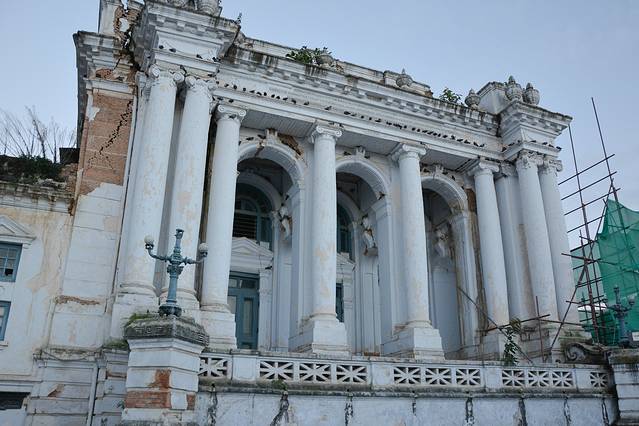 老皇宫受损严重,墙体开裂,周围被重重脚手架围起来