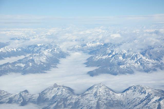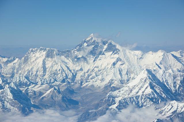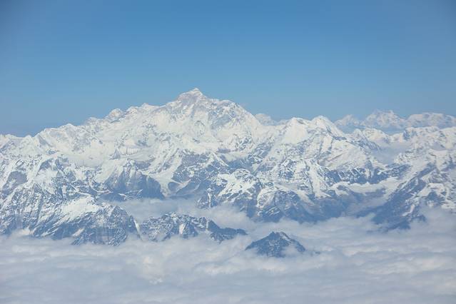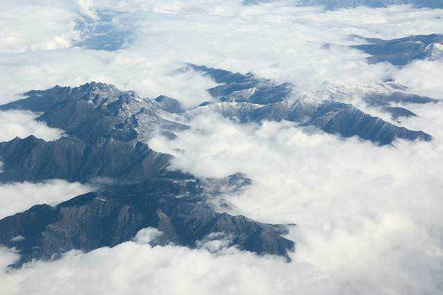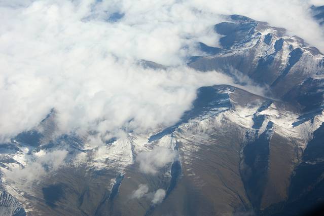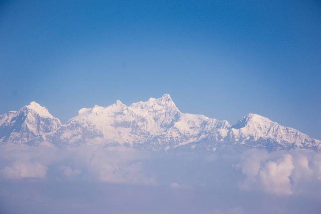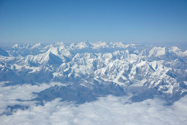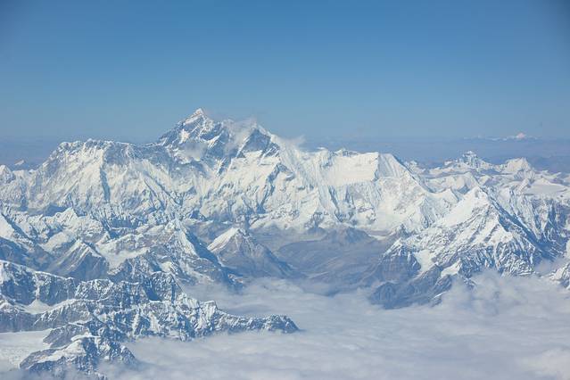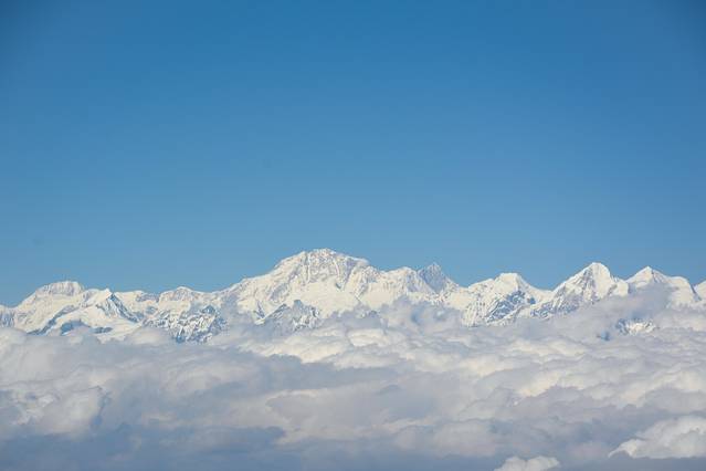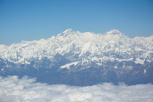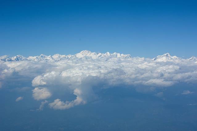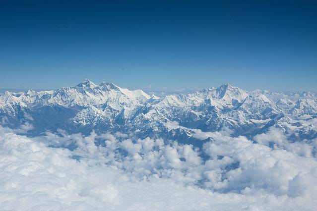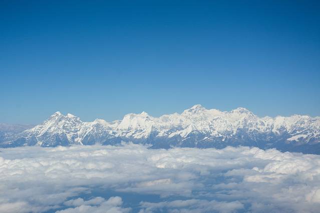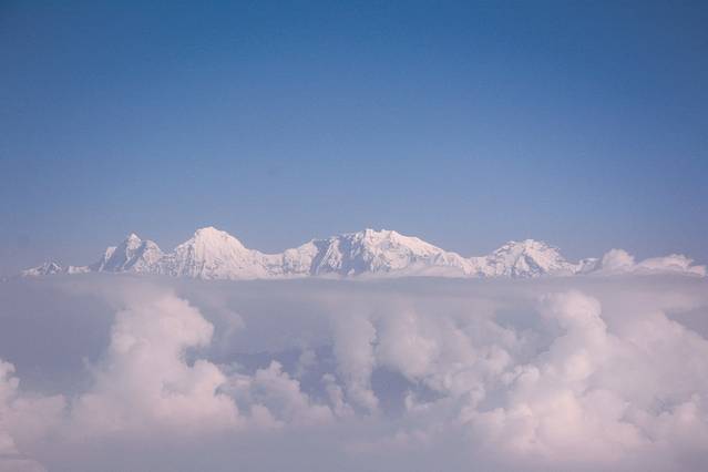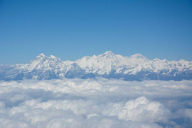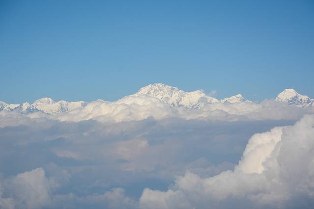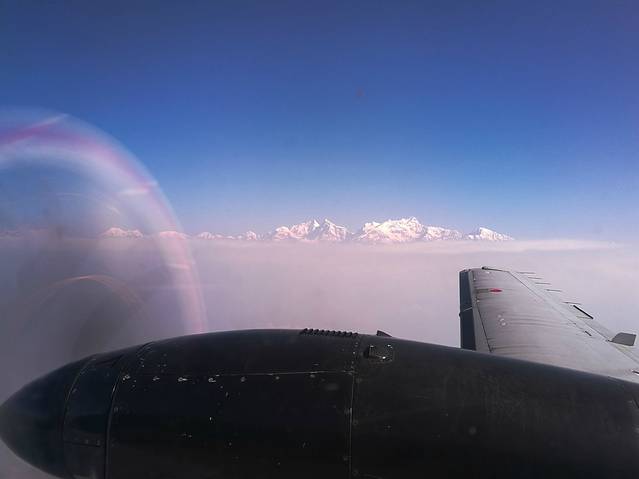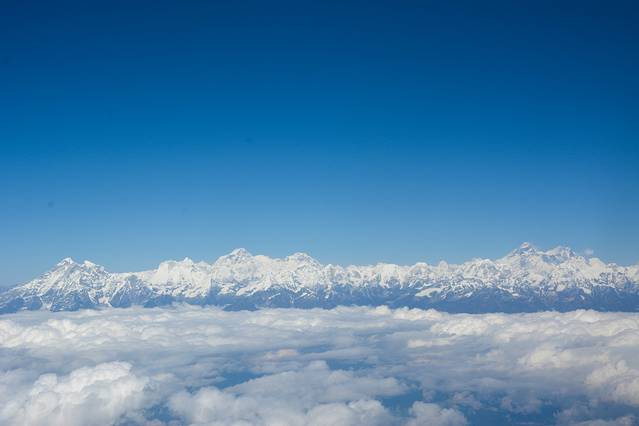 后两条线我不太清楚,从成都起飞的这条航线是从西藏上空飞越的,每隔一日还会经停拉萨,我就是去的时候是直飞加德满都,回来的时候经停了拉萨,感受了一把高原反应,当然没那么严重。这条线路上不仅可以在上空看到拉萨市和拉萨河,还可以看到壮观的雪山,其中尤为著名的是5座8000米以上的雪山——珠穆朗玛峰(Qomolangma/Everest,8844.43米)、洛子峰(Lhoste,8516米)、马卡鲁峰(Makalu,8463米)、卓奥友峰(Cho Oyu,8201米)以及飞机降落前看到的希夏邦马峰(Shishapangma,8012)。建议提前打电话预定座位,去程最好选则右侧靠窗的位置,为什么是右侧?首先上面说到的五座8000米以上的雪山都会出现在右侧,其实左侧也能遇到几座比较有名雪山,比如雅鲁藏布江折点处的南迦巴瓦峰,但因为印度洋北上的水汽所以这里几乎全被云雾遮盖着,其次,因为是早上的航班,我们地处北半球,所以上午太阳是在南边,也就是飞机的左侧向右照射,左侧自然就会比较晒比较晃眼,最主要的是在飞机右侧看到的景色都是被阳光正面照射的,而左侧都是处于逆光下的景色,自然要逊色一些了。